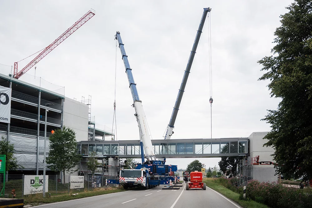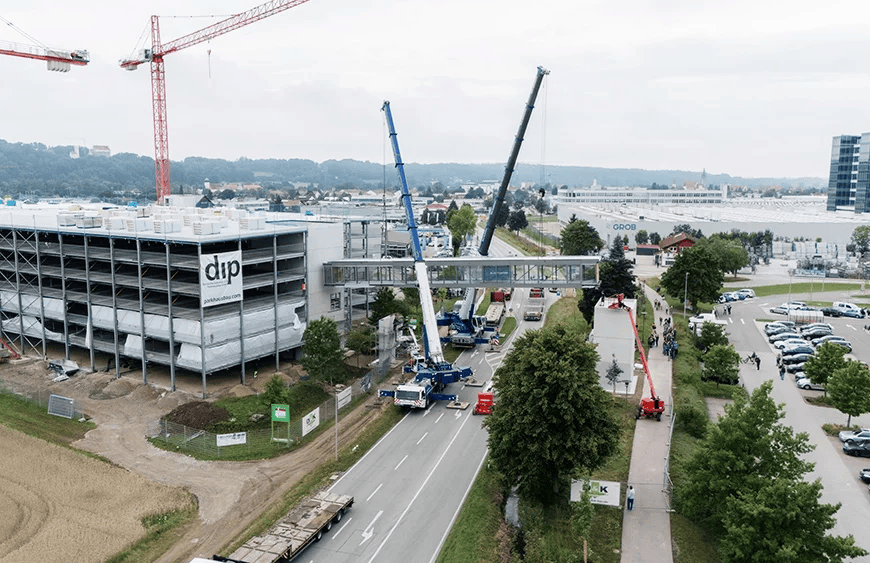 „Wir freuen uns sehr über das erfolgreiche Einheben der Fußgängerbrücke. Sie markiert einen bedeutenden Meilenstein im Baufortschritt unsers Parkhauses und leistet einen wichtigen Beitrag, unseren Kolleginnen und Kollegen einen sicheren und direkten Weg zu ihrem Arbeitsplatz zu ermöglichen“, erklärt Wolfgang Schuster, Leiter der Abteilung Gebäude- und Liegenschaftsmanagement bei GROB.